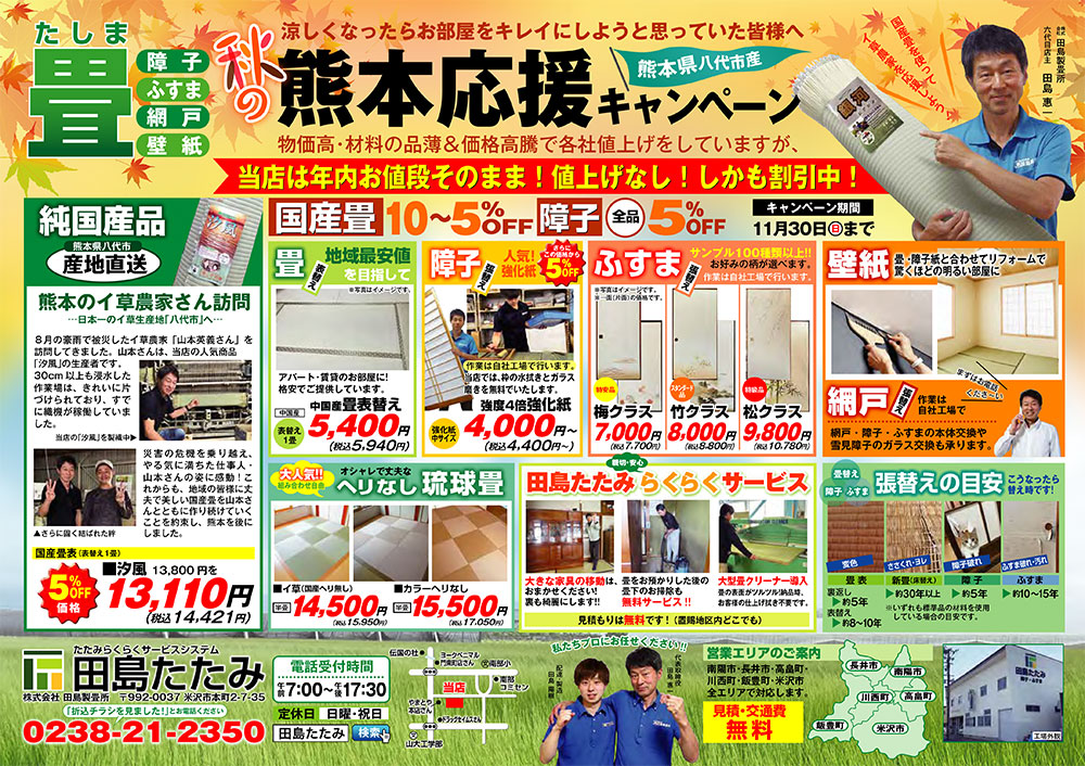田島たたみでは日頃のご愛顧に感謝を込めて2025年11月30日まで「熊本応援キャンペーン」を開催中です。